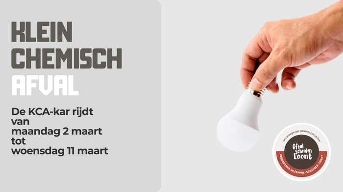 Van maandag 2 maart t/m vrijdag 6 maart en van maandag 9 maart t/m woensdag 11 maart halen we het klein chemisch afval (KCA) op, De KCA-kar rijdt de gebruikelijke ronde door alle straten en staat op vaste plaatsen stil. Bied je milieubox persoonlijk aan bij de chauffeur. Laat de milieubox nooit onbeheerd achter op straat. Voor spelende kinderen is dit gevaarlijk. Nog een tip: houd de milieubox bij de hand op de inzameldag. Zo loopt de KCA-kar geen vertraging op. Op deze pagina staan de inzameldagen en stratenlijst waarop de KCA-kar bij je langskomt. Alle overige informatie, bijvoorbeeld wat je allemaal mee mag geven, staat ook hier vermeld.